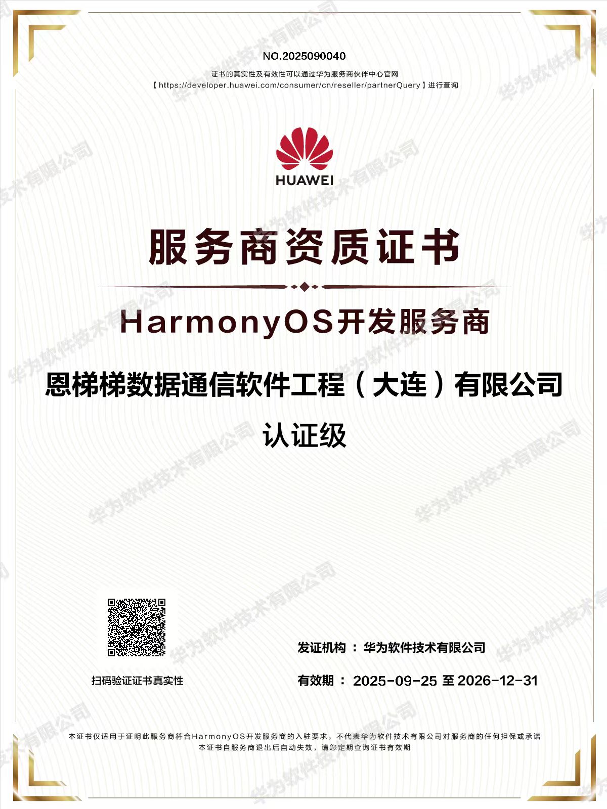 2025年9月25日,我公司正式获得华为官方颁发的HarmonyOS开发服务商资质证书。这标志着公司在智能操作系统领域的技术实力和服务能力得到了权威认可。